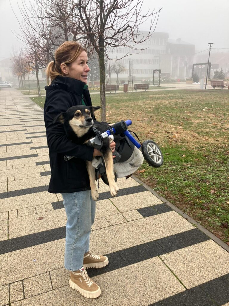 Ali evo u čemu je stvar: Kika se nikada nije uistinu privikla na kolica, bez obzira na to koliko smo ih verzija isprobali. Umjesto toga, donijela je vlastitu odluku — juri kroz život na svoje dvije prednje noge, brzinom i samopouzdanjem psa koji odbija biti definiran onim što mu nedostaje. Trči, igra se, istražuje i vlada dvorištem kao da joj dvije noge manje ne znače baš ništa.