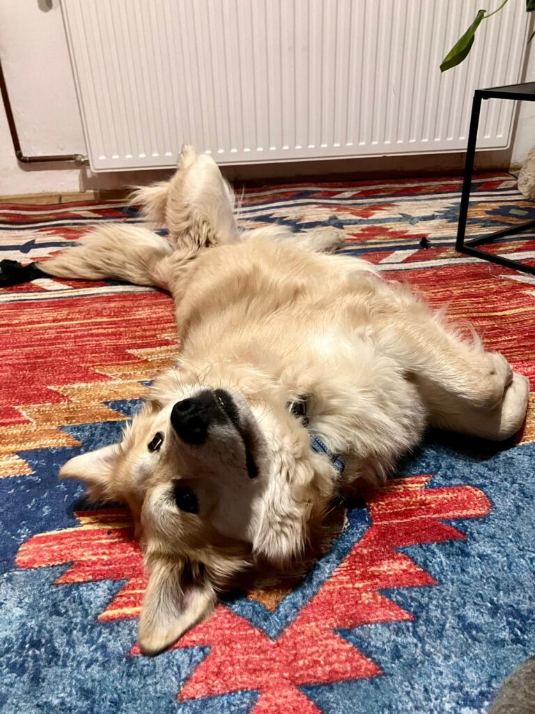 Like any young pup, Barney loves to chew and is still figuring out the difference between “dog toy” and “your favorite shoe” — so a bit of guidance (and sensible shoe storage!) is recommended. After a good long walk or a proper play session, though, he settles beautifully and is perfectly fine being left alone for a while.