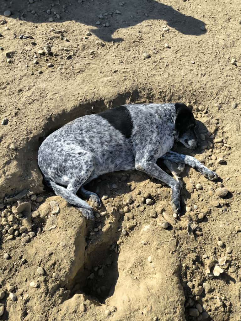 She loves to chill in her little house, and in the summer she goes full hermit crab — tucking herself into the cool underground hideouts her kennel mates dig.