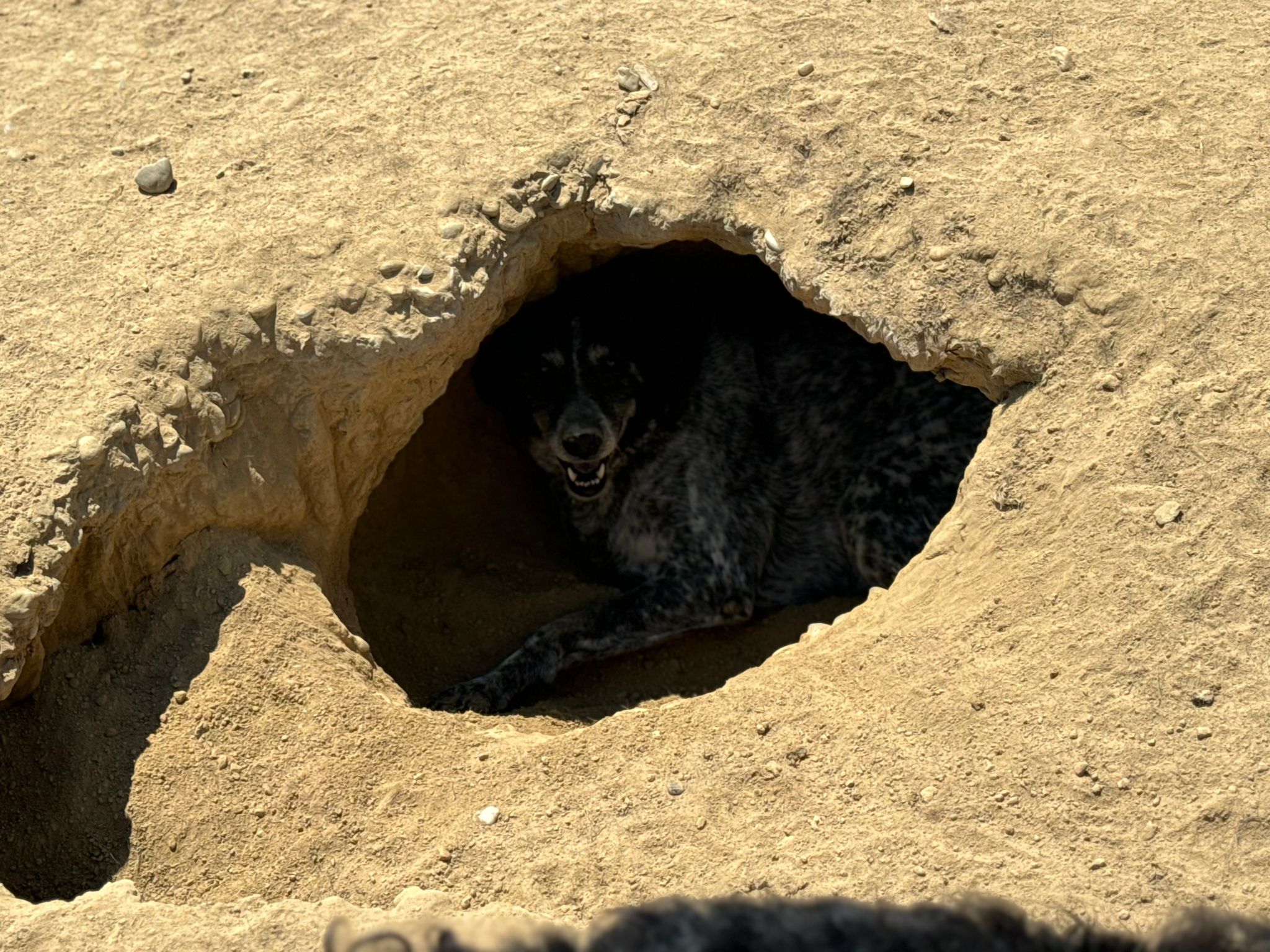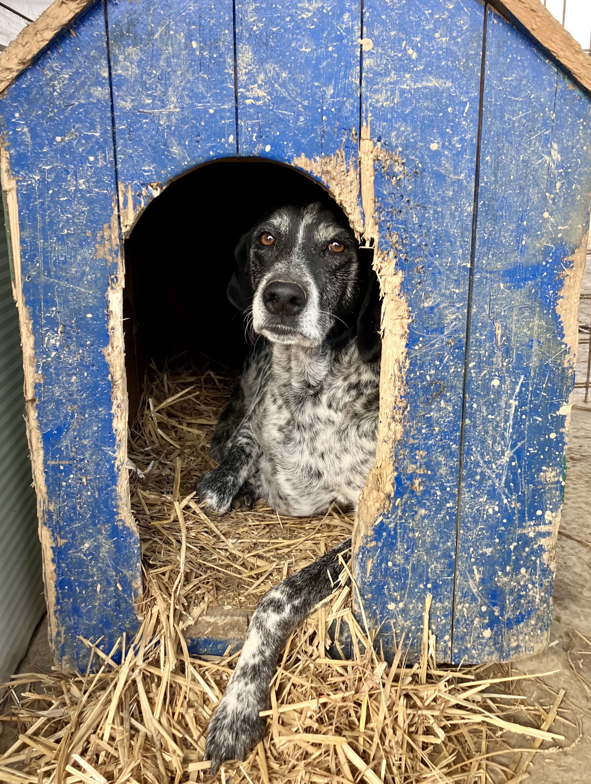 She loves to chill in her little house, and in the summer she goes full hermit crab — tucking herself into the cool underground hideouts her kennel mates dig.