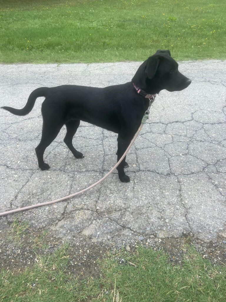 She walks well on the leash, and got used to the sounds of the world — cars, people, the usual — quickly on her few trips outside the shelter. She enjoys her walks and settles easily afterwards, just as happy relaxing on the sofa as she is sniffing around outside.